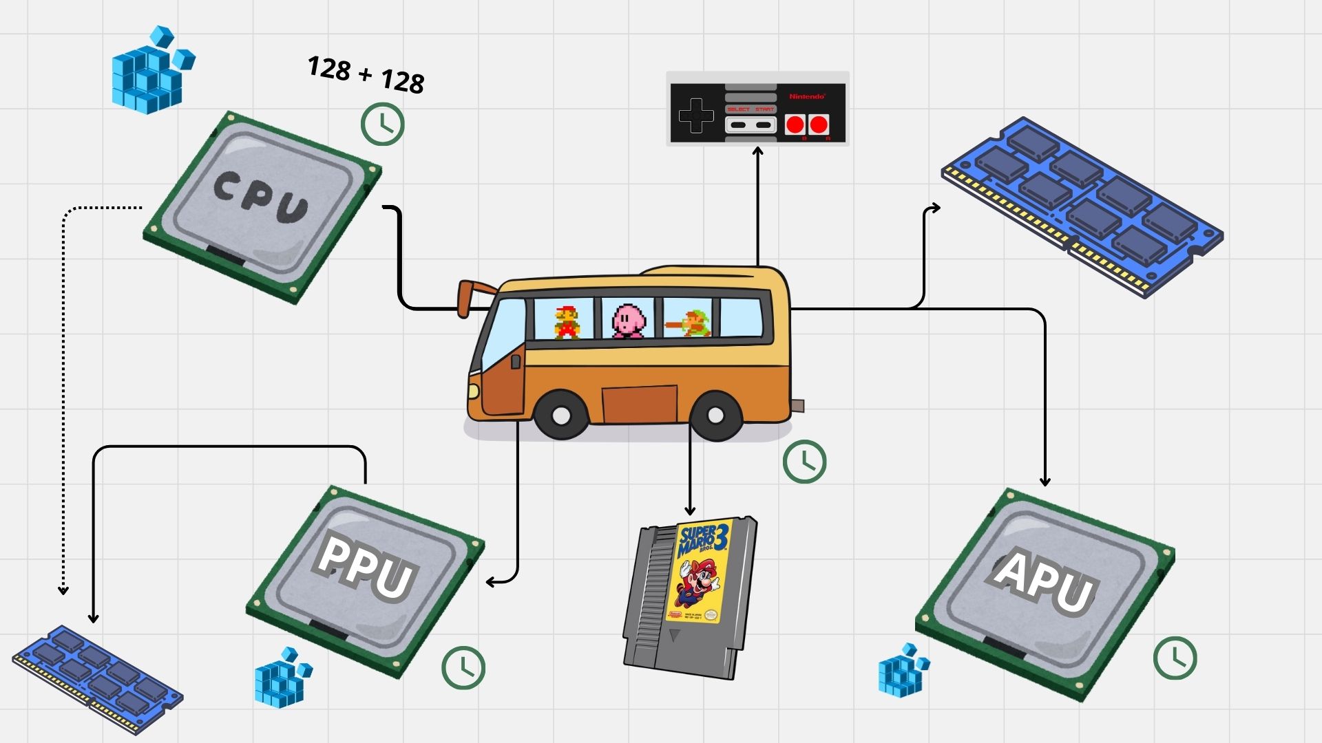 I won’t dive too deep into the technicalities. However, one final thing to mention is that components can have side effects on each other: for example, when the PPU or APU loads a big chunk of data from the CPU’s VRAM (OAM), it causes the CPU to halt for a couple of cycles. Alternatively, some operations can cause a CPU Interrupt, causing it to stop its execution flow and run a given sequence of instructions.
